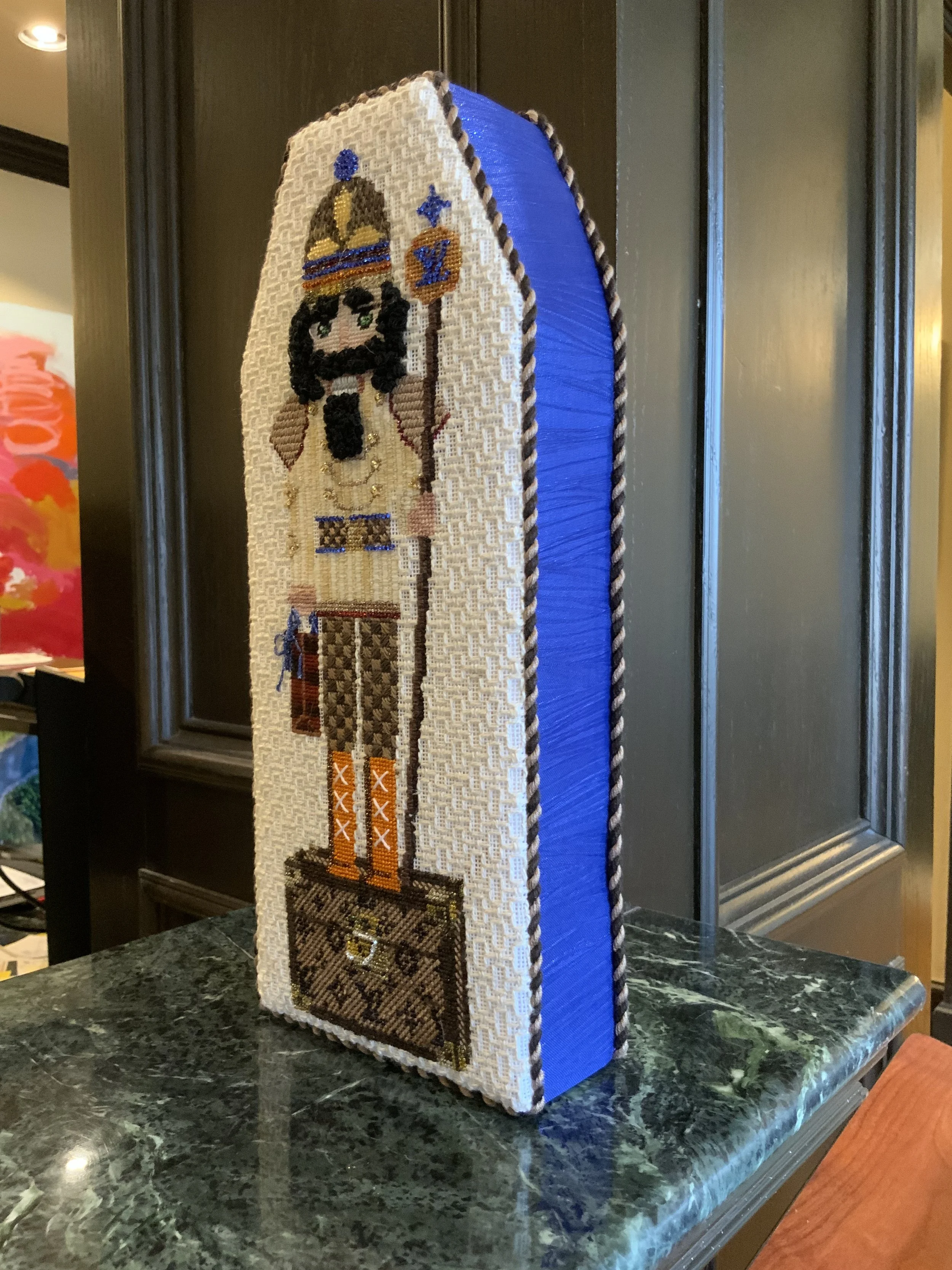 Finishing is the process of turning a stitched Needlepoint canvas into a keepsake for display, functional use or heirloom.